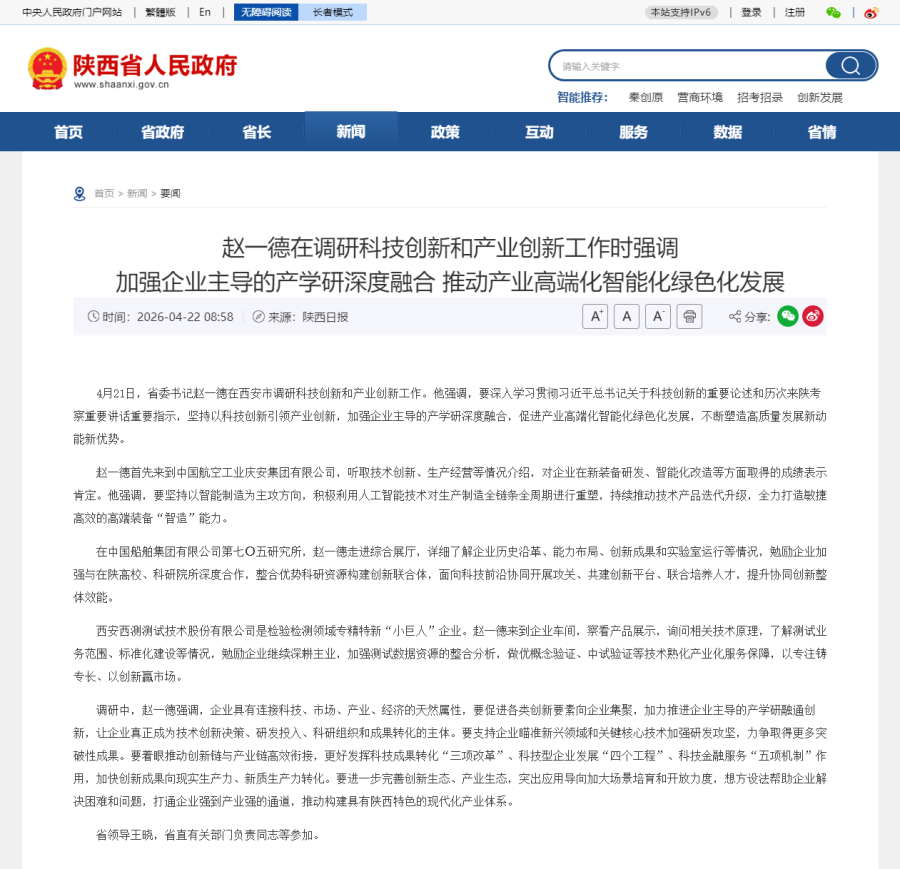 赵一德在调研科技创新和产业创新工作时强调 加强企业主导的产学研深度融合 推动产...